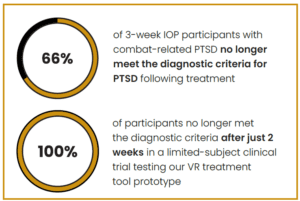 - We’ve created a proprietary VR treatment tool that – in a limited-subject clinical trial – helped 100% of participants no longer meet the diagnostic criteria for PTSD after just 14 days.